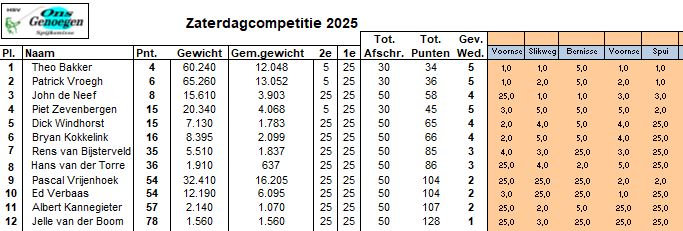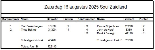 In vak A viste Theo Bakker zich op 2 naar vakwinst met een ouderwets hoog gewicht van 31.3 kilo. Op de kop vissend kon Piet Zevenbergen zijn tempo niet evenaren en eindige met een fraaie 15,1 kilo op twee.